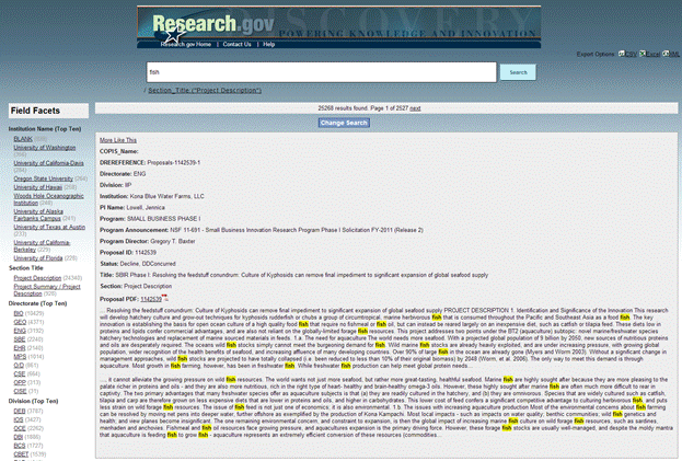 The results will display key data fields (such as title, institution name and program) as well as relevant text with the keywords highlighted. As of May 2012, results also include a link to the proposal PDF, and the ability to export Search Results to Excel, CSV and XML formats.