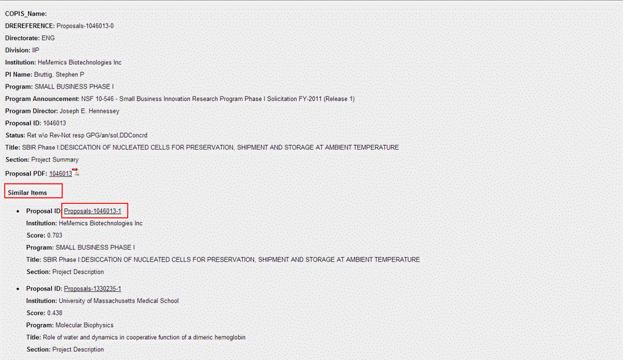 You can also view proposals using the view “More Like This” feature. Click on the “More Like This” link above each proposal to view five similar proposals. A “score” is also displayed indicating the degree of similarity for each similar result. You can access the PDF file for each proposal by clicking on the Proposal ID link and can also view other pertinent information about the similar items such as Institution, Program, Title and Section.