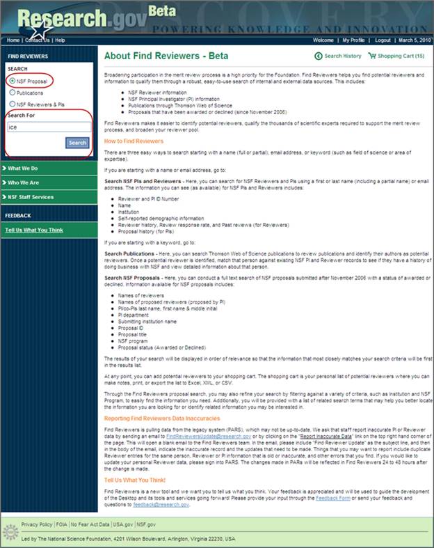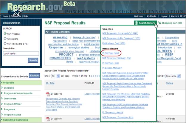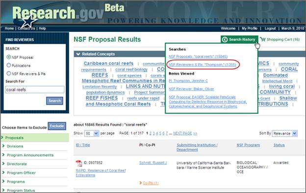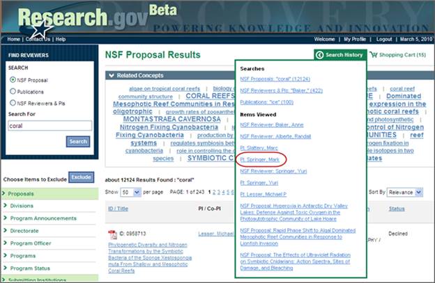 Through the Search History, you can select, from a list of links, any of the last ten Reviewer, PI, or Proposal Information pages that you viewed. This history is maintained for your current Find Reviewers session, but is not saved after you logout or close the browser.