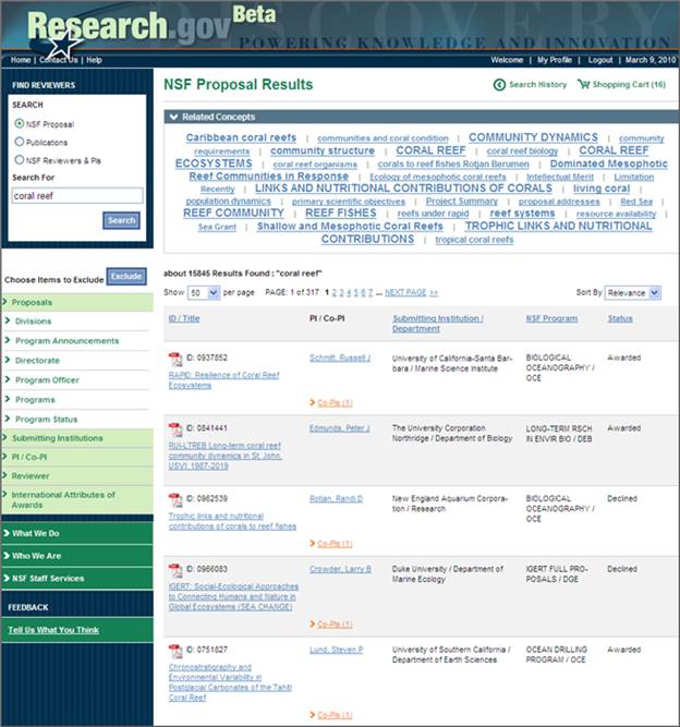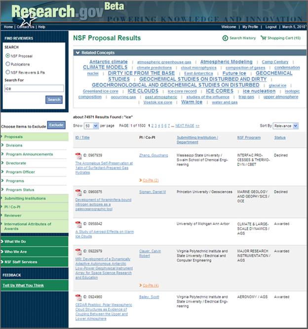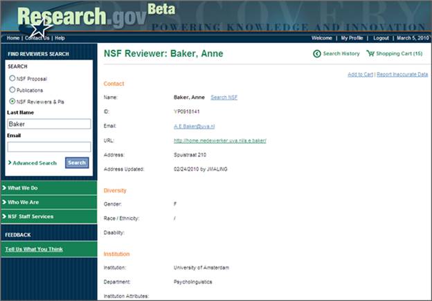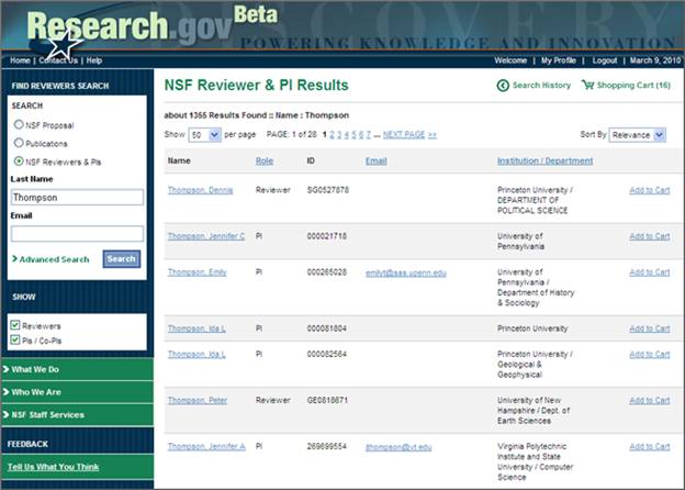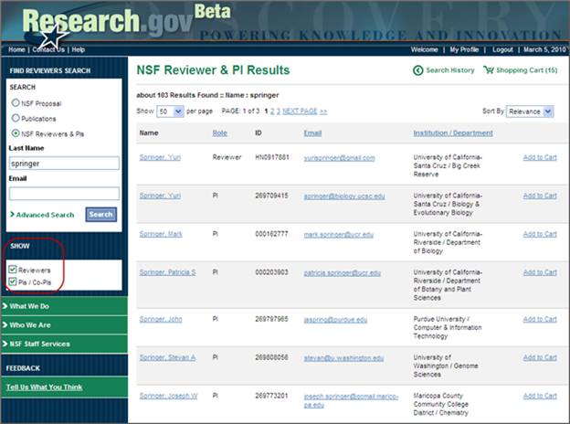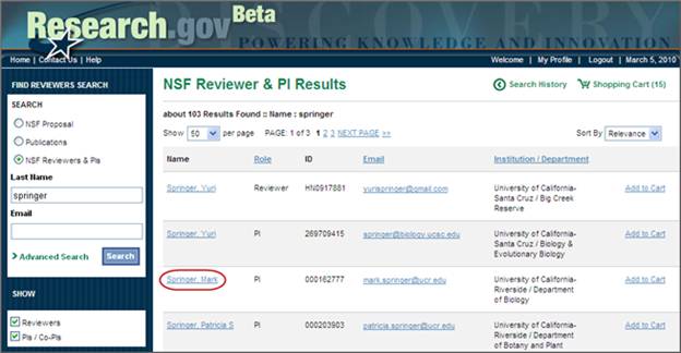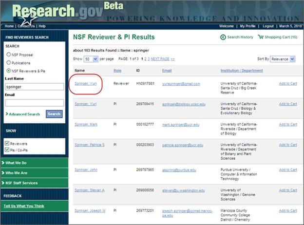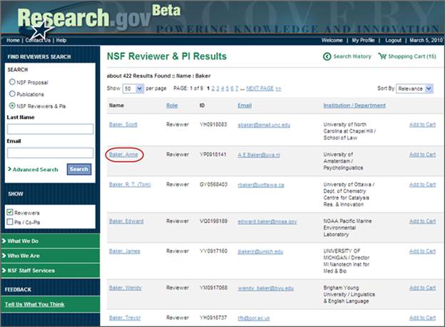 Figure 10 – NSF Reviewers & PIs Search Results Page