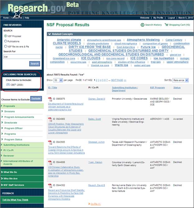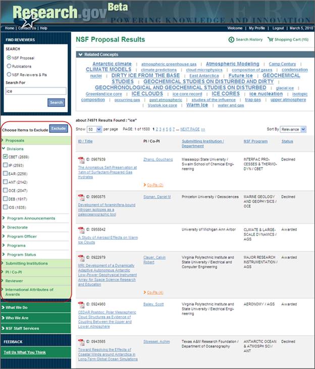 Select a category (e.g., Program Announcements, Program Officer, Directorates, etc.) from the Choose Items to Exclude menu on the left side of the NSF Proposal Results page (see Figure 4). The criteria included in the menu are based on the information included from the list of proposals generated by your search. For example in Figure 4, the user clicked on the Divisions category and as a result, was shown a list of Divisions that applied to the proposals listed in her search. Selecting one of these criteria (e.g., the name of a specific Division) will refine your search to exclude all proposals from your search results list that match your original search term and include your filtering criteria (for example, proposals that include the term global warming and were submitted to the Chemical, Bioengineering, and Transports (CBET) Division). You can select up to a maximum of 30 filters. After you have finished selecting fields to filter out of the search results, click Exclude (see Figure 4)