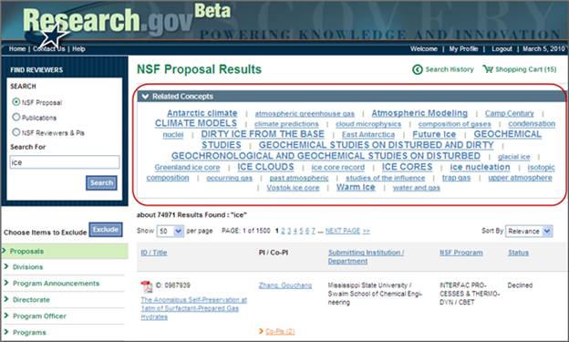 Click on one of the concepts (for example, climate change) to start a new search for NSF proposals that contain the search term. Please note that this will begin a new keyword search of NSF Proposals and is not a way to refine your current search results. The new search will also clear any filters that you had selected. If you did not intend to navigate away from your current search results screen, you can return to your previous search results screen through the Search History or by clicking the back button.