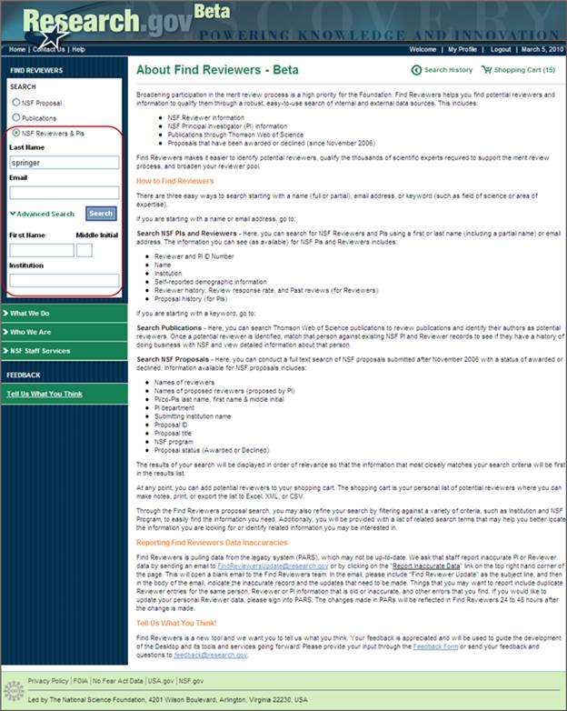From the Find Reviewers Homepage (see Figure 9), select the Find Reviewers Search option for NSF Reviewers & PIs.