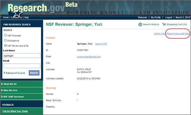 Find Reviewers is pulling data from the legacy system (PARS), which may not be up-to-date. We ask that staff report inaccurate PI or Reviewer data by sending an email to FindReviewersUpdate@research.gov or by clicking on the PI or Reviewer to view their detail page (See Figure 11) and then clicking on the Report Inaccurate Data link on the top right hand corner of the page (See Figure 12). This will open a blank email to the Find Reviewers team. In the email, please include “Find Reviewers Update” as the subject line, and then in the body of the email, indicate the inaccurate record and the updates that need to be made. Things you may want to report include duplicate Reviewer entries for the same person, Reviewer or PI information that is old or inaccurate, etc.