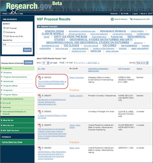 Note: The system searches the full text of NSF proposals that were submitted since November 2006 and the titles of proposals submitted before November 2006. NSF Search Results will include only proposals with the status of awarded or declined proposals and exclude any proposal submitted by a current employee or current IPA at NSF.