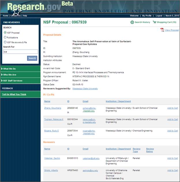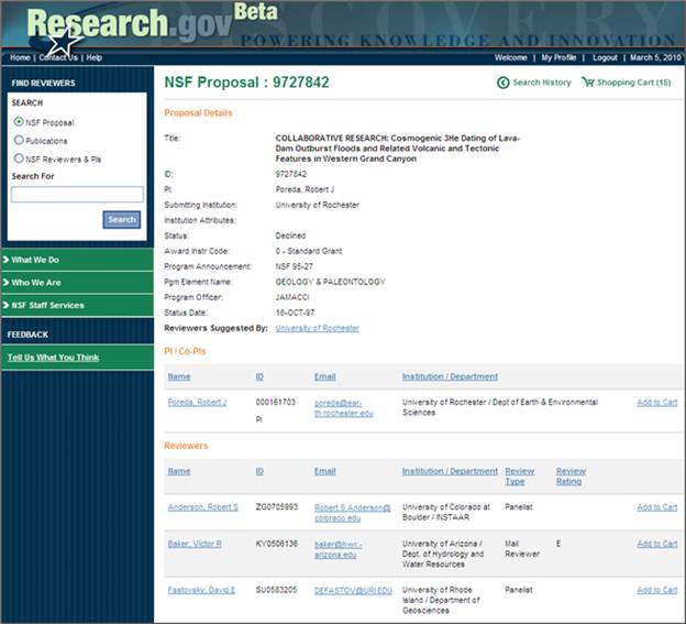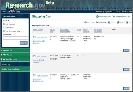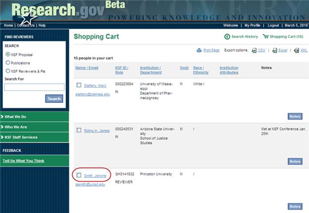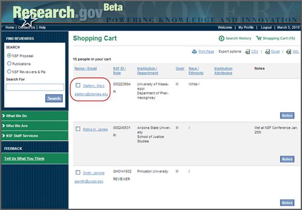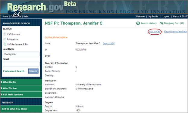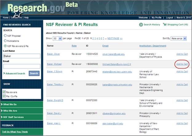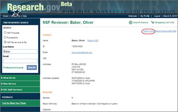 Adding Person to Shopping Cart from NSF Reviewer & PI Results
