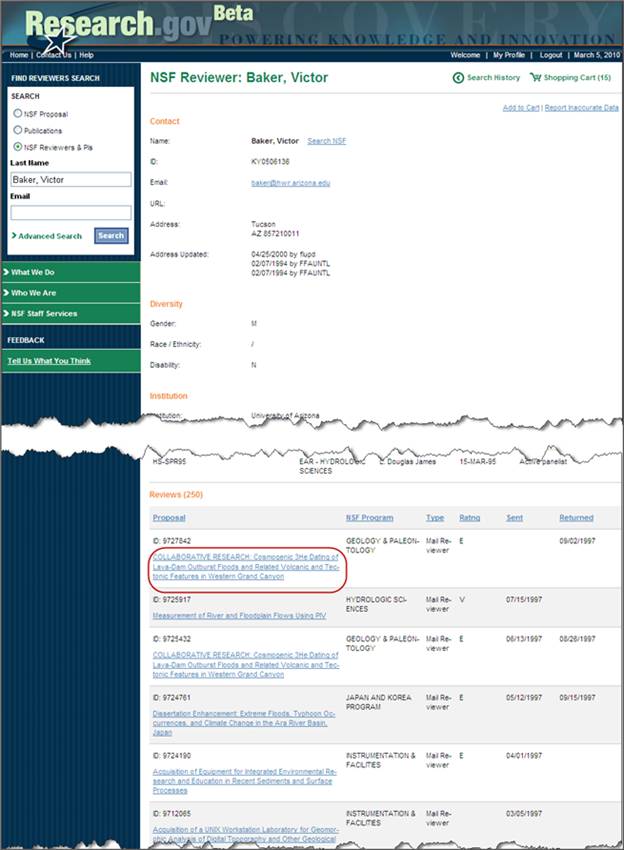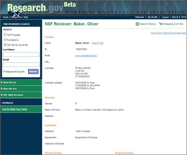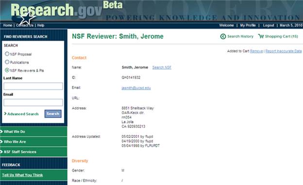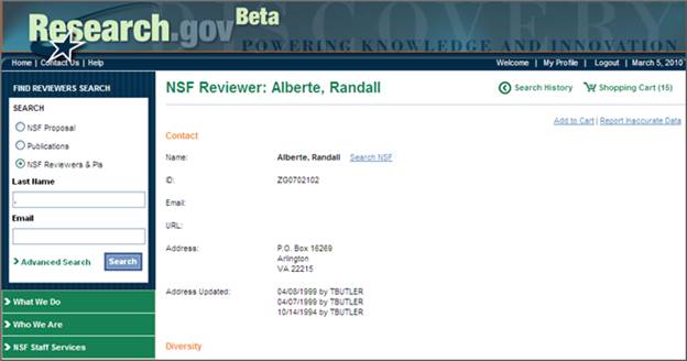 Viewing NSF Reviewer Detail Page from NSF Reviewer & PI Results