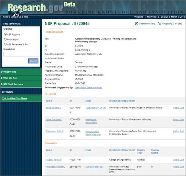 To add a PI or Reviewer record to the Shopping Cart click Add to Cart for a record displayed in the PI/co-PIs or Reviewers section of the NSF Proposal Detail page (see Figure 37). The system will save the record to the Shopping Cart where it remains until you select the option to Remove it.