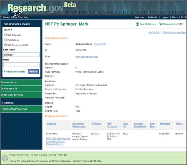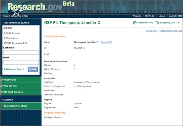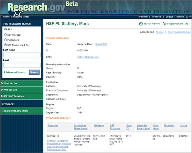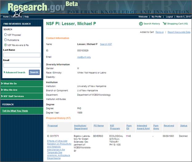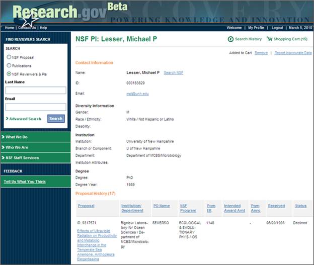 To view detailed information for a PI, click on a PI Name on the Shopping Cart page (see Figure 27). The NSF PI Detail page will display (see Figure 28).
