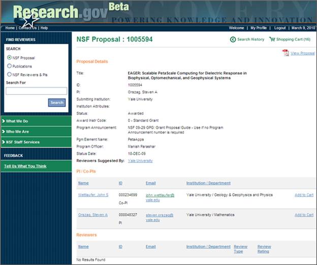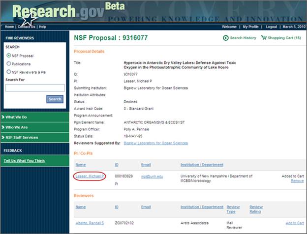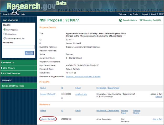 Viewing NSF Reviewer Detail Page from NSF Proposal Detail