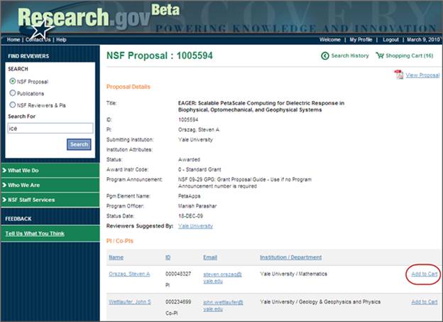 Adding Person to Shopping Cart from NSF Proposal Detail