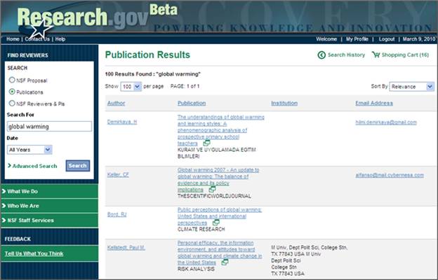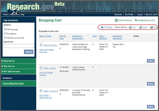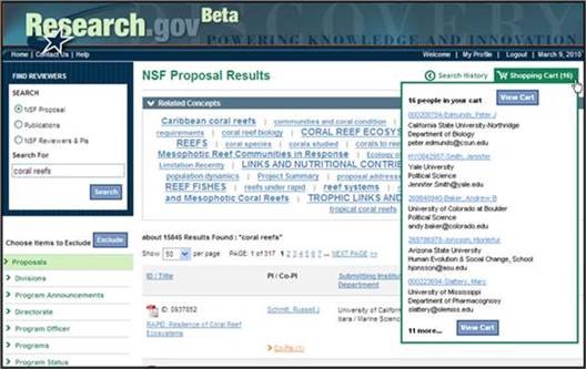 You can compile a list of potential reviewers in a single location by adding NSF PI/co-PI and Reviewer records or Author records from Thomson Science. This list is saved in your Shopping Cart and will remain there until you choose to the remove them. If you end your session without clearing your shopping cart, your list of reviewers will still be in the cart the next time you access Find Reviewers. You can add records to the Shopping Cart from the following pages: