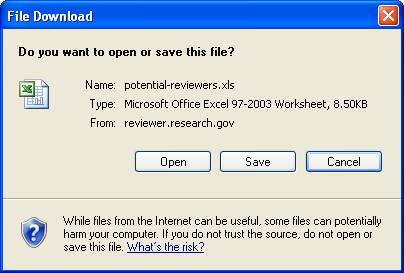 To export the list of potential reviewers to Excel, CSV or XML, select the appropriate link for the export option of your choosing in the upper right corner of the Shopping Cart / Complete List page (see Figure 43). A File Download window will be displayed (See Figure 44).