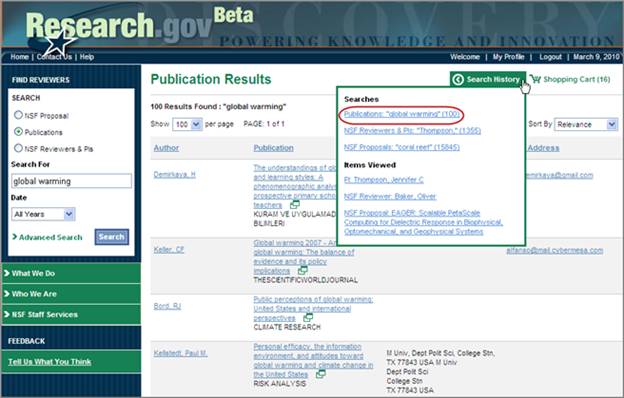 You can view the results for each of the last searches you submitted for: NSF Proposals, Publications, or NSF Reviewers & PIs. The search results displayed through Search History reflect any filters you applied after the original search was submitted. This history is maintained for your current user session, but is not saved after you logout or close the browser.