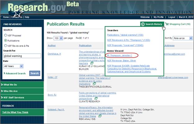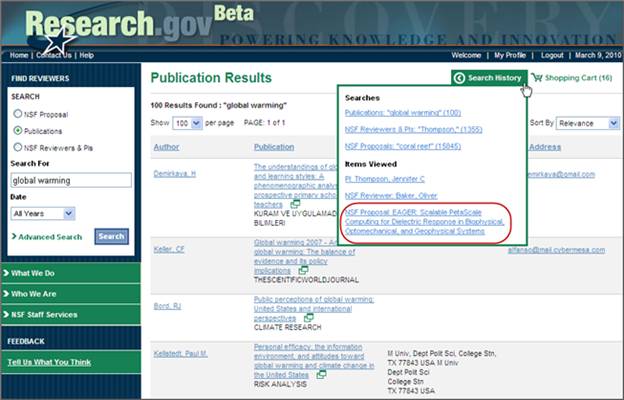 Figure 49 – Search History Page – NSF Reviewers and PIs