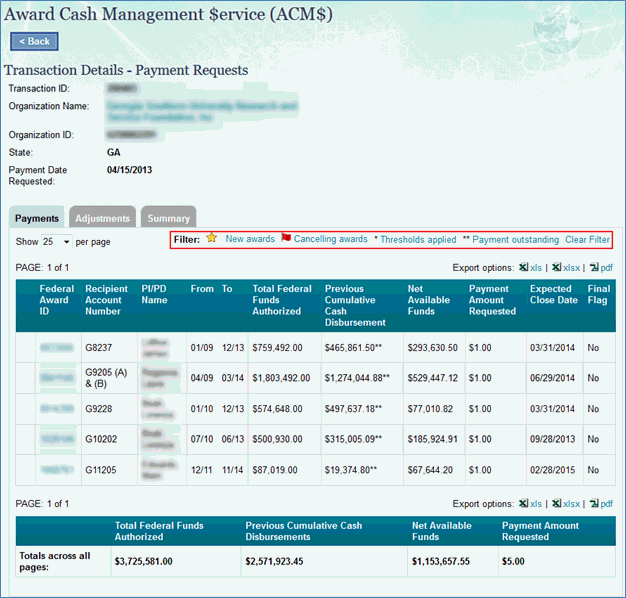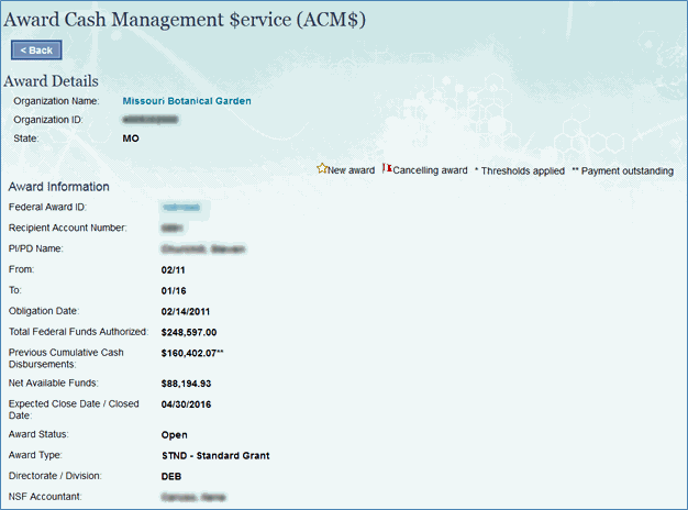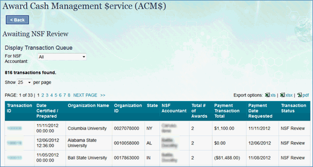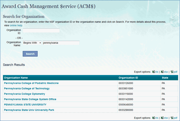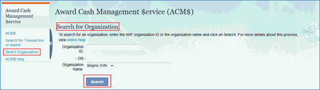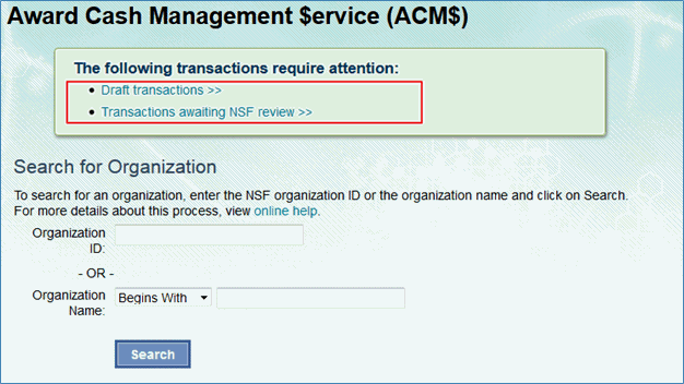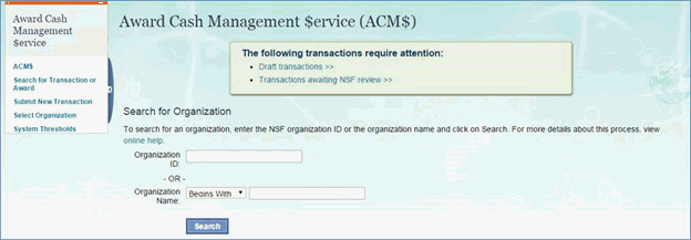 The Award Cash Management $ervice (ACM$) is NSF’s approach to award payments and post-award financial processes. This approach requires the submission of award level payment amounts each time funds are requested.
