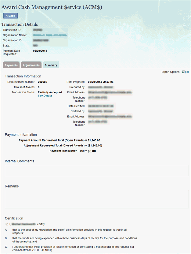 Note: Clicking “Reject Transaction” will send the transaction back to draft status. Also, NSF Certifiers will only certify payments originated by NSF Accountants.