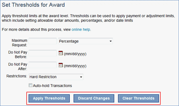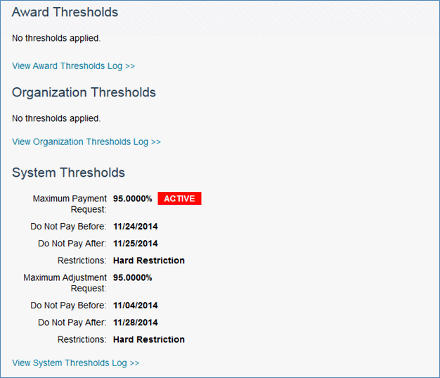Thresholds can be applied at the system level, organization level or award level. Only users with an NSF Certifier role can apply thresholds at the system level.