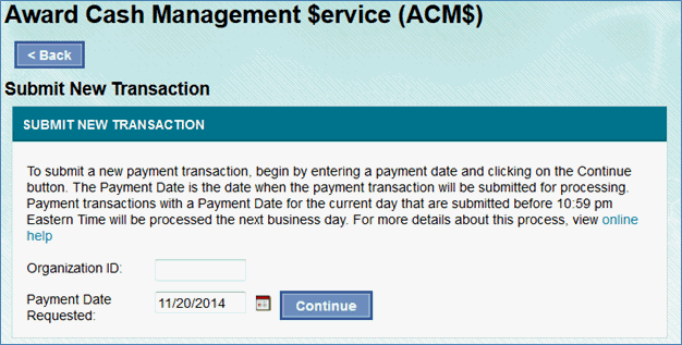 a. Select the “Submit New Transaction” link in the left navigation and enter an organization ID or
