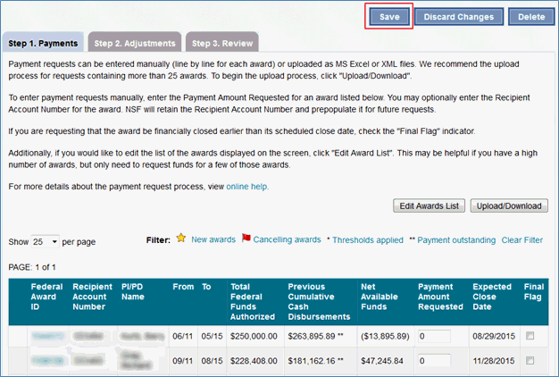 Note: If desired, you can input the recipient account number for each award under the Recipient Account Number column.