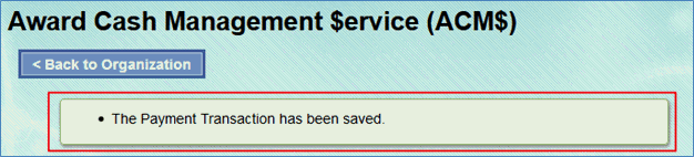 6. After selecting “Save,” a pop-up box will appear informing you that the payment transaction has been saved. If there are any error messages, they will have to be corrected before you can continue.