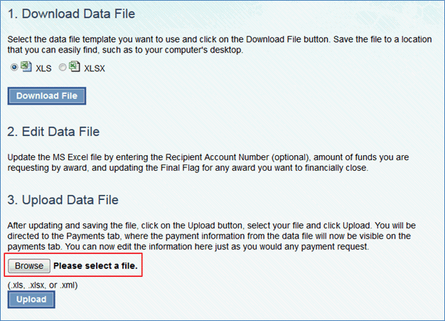 5. Select the “Browse” button and locate the Excel or XML file containing the payment transaction and click the “Upload” button. The system will display a confirmation that the upload was successful or an error if unsuccessful.