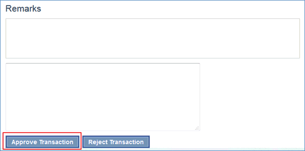4. You will be able to review transaction details and enter internal comments (visible to NSF users only) or remarks (visible to all users) and then select either “Approve Transaction” or “Reject Transaction.”
