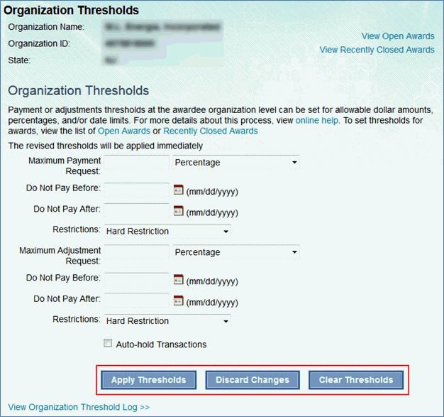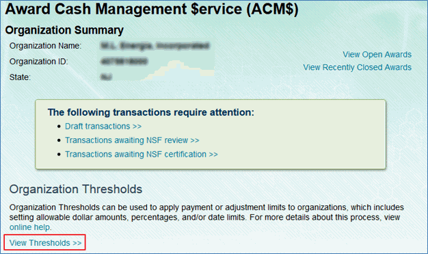 2. On the Organization Summary screen select the “View Thresholds” link under the organization thresholds header.
