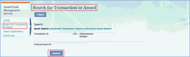 1. Click on the “Search for Transaction or Award” link on the left menu or by the ACM$ homepage.